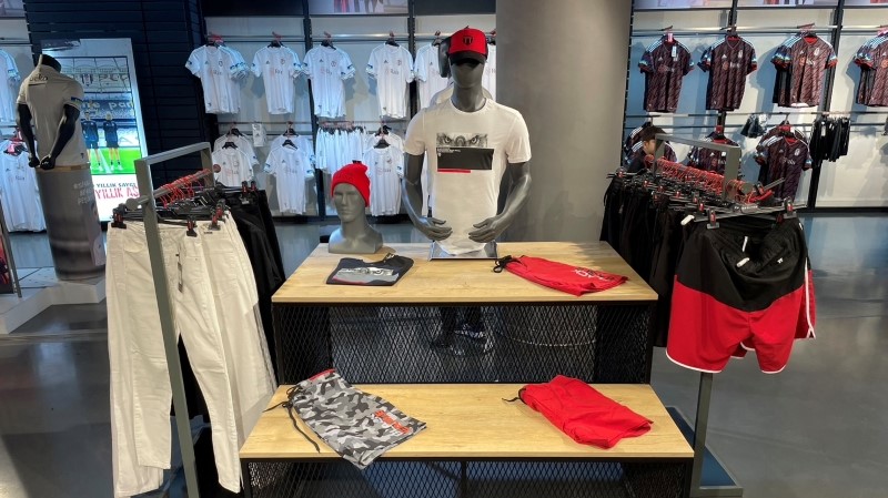 エスカレーターに乗って地下のフロアへ降りると、ジュニア用のユニフォームや幼児用の衣類、布団カバーなどが並んでいた。成人用のアパレル同様、幼児用の衣類も様々な種類を用意している点が面白い。さすがトルコの人気クラブ。将来のサポーターの英才教育までしっかり行っている。