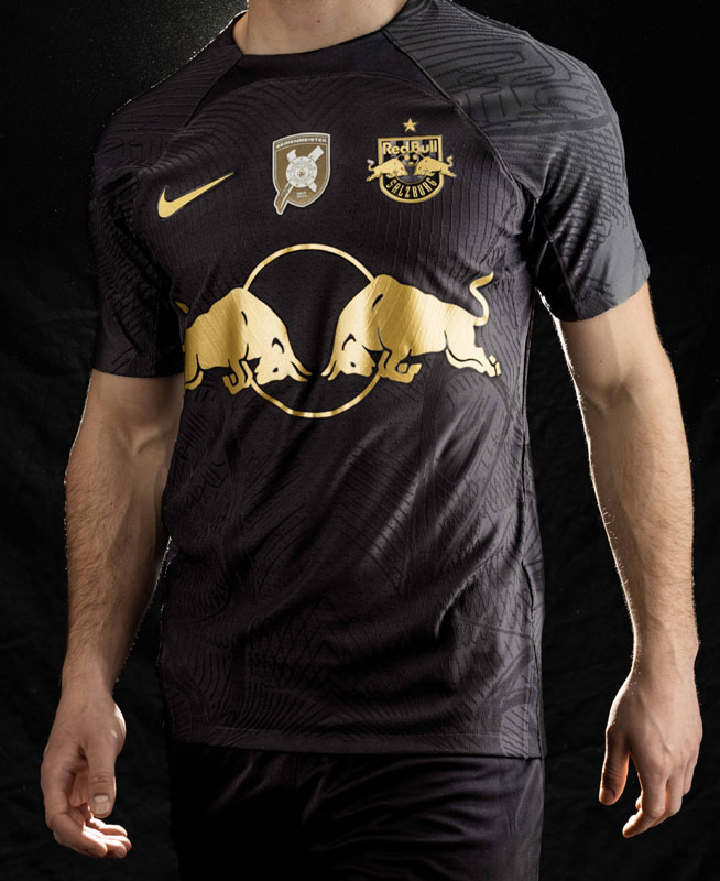 今季のリーグ戦を優勝し、2013-14シーズンから10連覇を達成したザルツブルク。それを記念した特別ユニフォームはブラックを基調とし、エンブレムやメーカーロゴなどを全てゴールドで彩った華やかなデザインだ。
