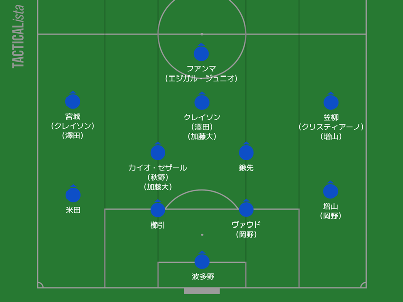 様々な組み合わせが試されている2列目は、ブレイクの予感を漂わせる笠柳翼、トップ下と左サイドを兼務するクレイソン、積極的な仕掛けが武器の宮城天が主力の座に。一発の破壊力があるクリスティアーノ、攻守に計算できる澤田崇、走れる司令塔の加藤大(ボランチと兼務)らも控えており、増山も一列前で起用されるなど争いは熾烈だ。