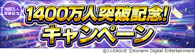 KONAMIは、Jリーグ公式モバイルゲーム『Jリーグクラブチャンピオンシップ』で登録会員数1400万人突破を記念したキャンペーンを開催している。