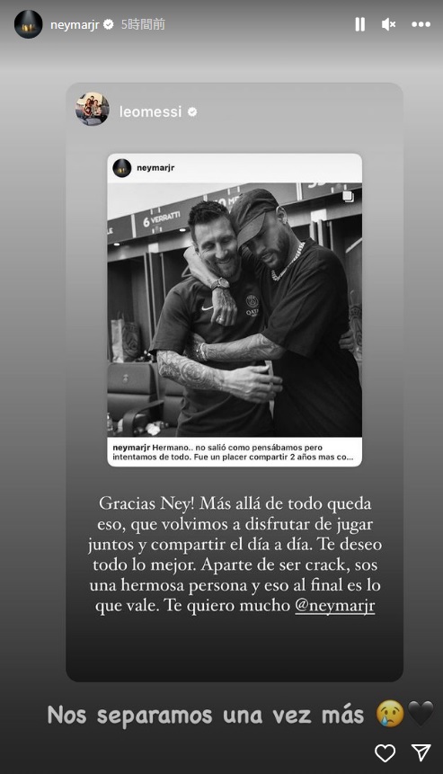「ネイマールのなんて素敵なメッセージなんだ。君とレオがまた一緒になれたのを見るのはとてもいいことだった。でも、それ以上に素敵なのは、君たちはお互いに愛情を持ち、常に互いを支え合っていること!2人とも愛しているぜ」とのメッセージを送っている。