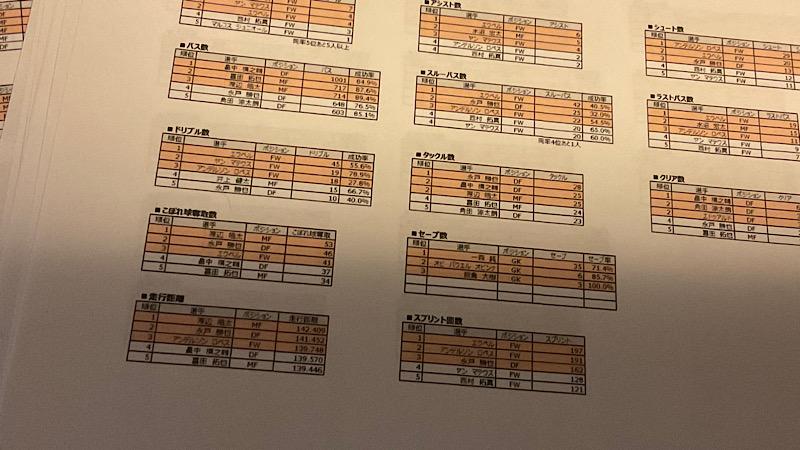 そして次に見てもらったのは、各チームにおける選手ごとのデータだ。パス数やシュート数、走行距離など様々な項目があり、それぞれの選手の記録がランキング形式に集計されている。