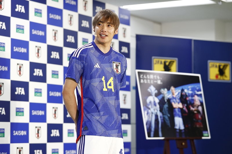 メジャーパートナー契約締結に関する調印式の後、クレディセゾン公式アンバサダーに就任した伊東純也が日本代表ユニフォームを着用して登場!