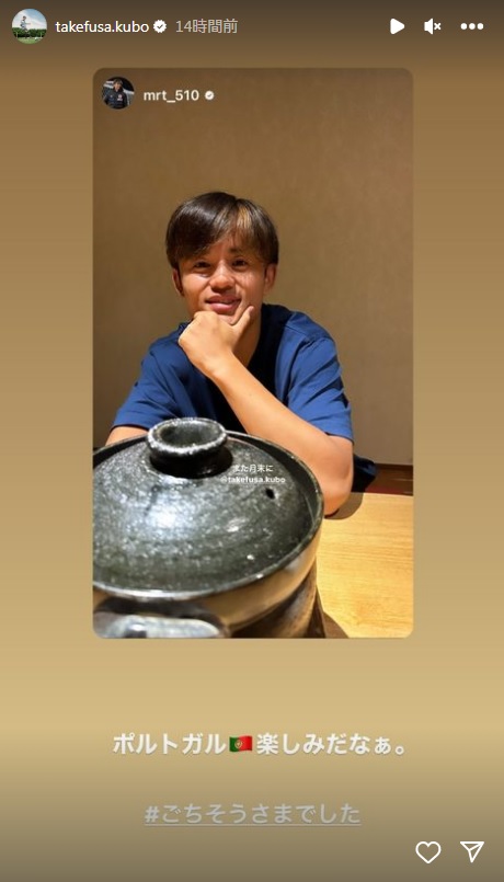 守田は「また月末に」、久保は「ポルトガル楽しみだなぁ。ごちそうさまでした」とのメッセージを綴っている。