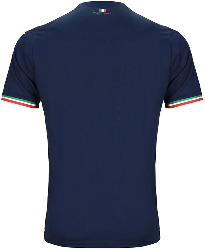 23-24新アウェイユニフォームは、ダークネイビーを基調にエンボスで水平ストライプ(ボーダー)をデザイン。背面にはホームと同じようにセリエA初優勝50周年記念のプリントを施す。