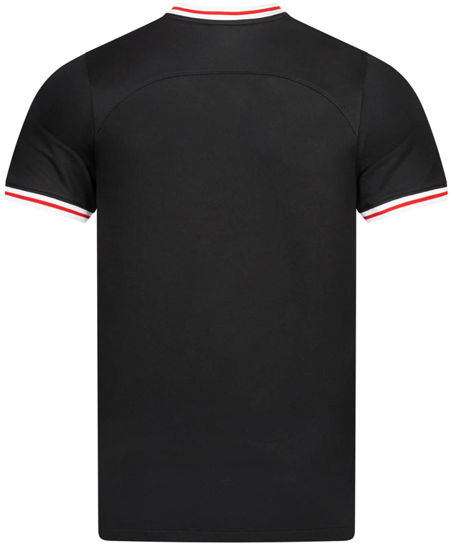 23-24新アウェイユニフォームはブラックを基調としたシンプルなデザイン。アウェイユニにブラックの採用は2年連続となる。襟と袖口に配したストライプがクラシックでお洒落だ。