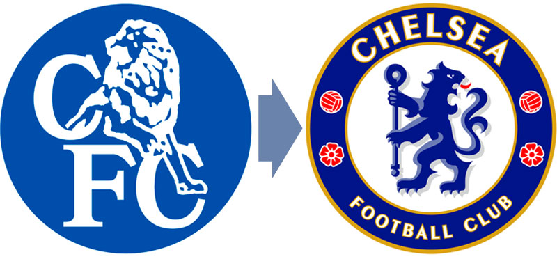 チェルシーは過去に何度もエンブレムを変更してきたクラブ。画像左の文字「CFC」にライオンを組み合せた青い旧デザインは2003-05シーズンのみの使用だが、このスタイル自体は色を変えて1986年から使い続けていた。