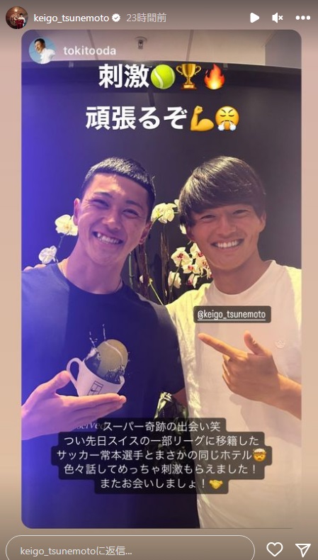 小田は「スーパー奇跡の出会い(笑)つい先日、スイス1部リーグに移籍したサッカー常本選手とまさかの同じホテル。色々話してめっちゃ刺激もらえました!またお会いしましょ!」と投稿。