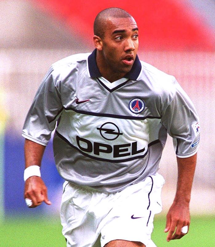 当時のPSGユニフォームでは異色のシルバーグレーを基調としたデザイン。「OPEL」の文字とブランドロゴの並びを変えて99-00シーズンから継続で使用した。画像のクリスティアンは2005年に数ヶ月だけ大宮アルディージャでプレーしたブラジル人選手。