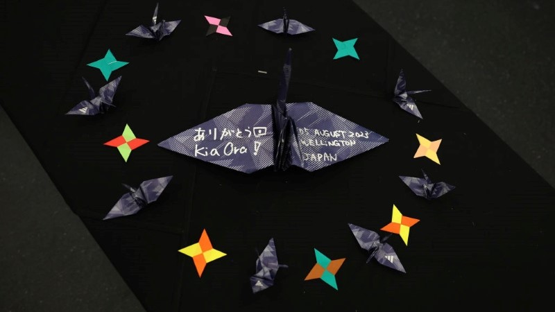 今回は折り鶴の翼に「ありがとう(日本国旗)」とニュージーランド原住民族のマオリ語で「Kia Ora!(元気でね)」とメッセージを残し、折り紙の手裏剣と小さな折り鶴と可愛らしく会場を去っていった。
