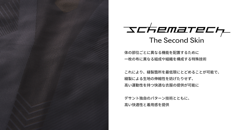 “第2の皮膚”をコンセプトに開発された「Schematech®」を様々な商品に応用できるよう進化させるだけでなく、各競技シーンに適したパターン設計技術と融合させることで、動きやすさを生み出し、ストレス軽減とパフォーマンスの向上をサポートするという。