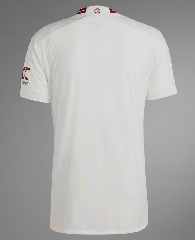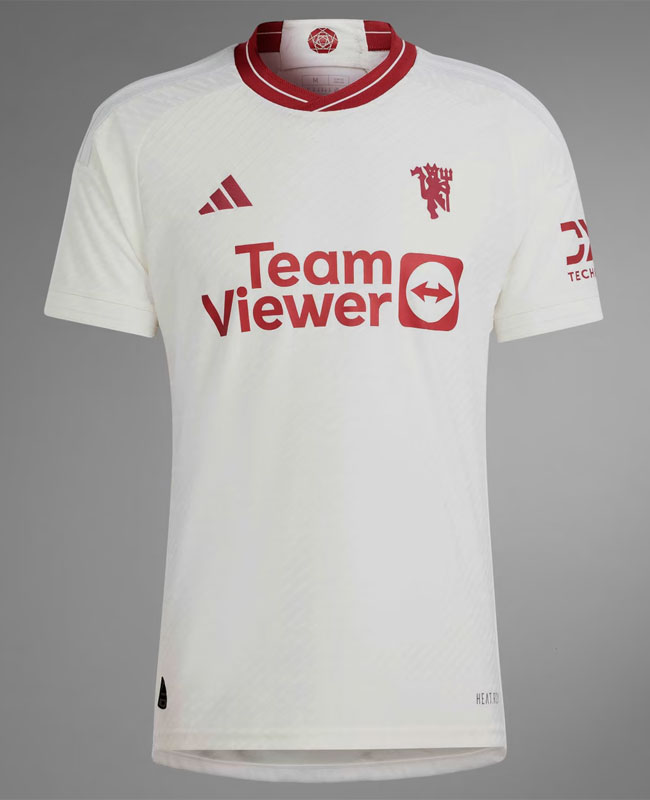 23-24新サードユニフォームは、ホワイトを基調に各部をレッドで統一するクラシックなスタイル。左胸には通常のエンブレムではなく“赤い悪魔”を単体で配置し、ついにこの象徴がソロデビューを果たした。