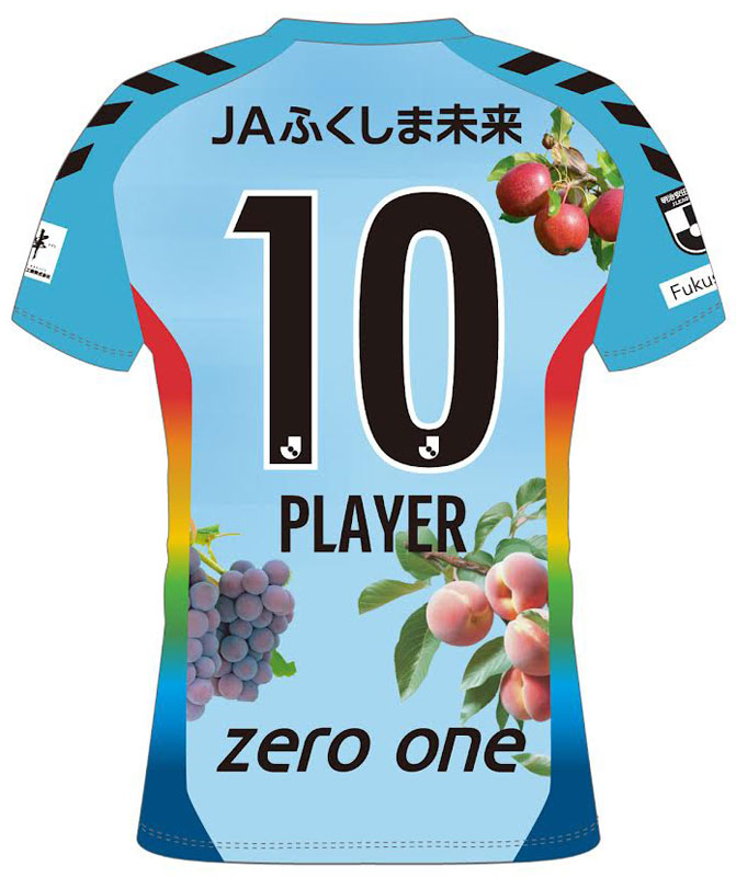 背面には「福島ユナイテッドFC農業部」で生育している桃、ぶどう、リンゴをあしらい“豊かな実り”を描く。