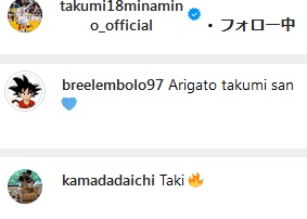 そのエンボロは「アリガト、タクミサン」というメッセージをハートの絵文字つきで投稿。また、南野と仲良しの鎌田大地も「Taki」と炎の絵文字つきでコメントしていた。