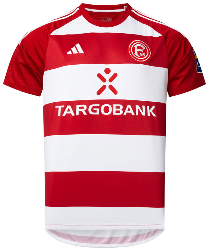 23-24新ホームユニフォームは、レッドとホワイト懐かしいブロックボーダーデザインが登場。基調の2色はホームタウンであるデュッセルドルフの旗の色と共通する。