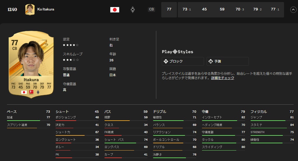 スピード73、シュート45、パス59、ドリブル70、守備79、フィジカル77