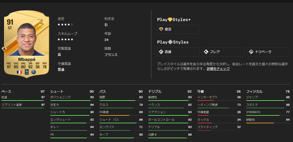 スピード97、シュート90、パス80、ドリブル92、守備36、フィジカル78