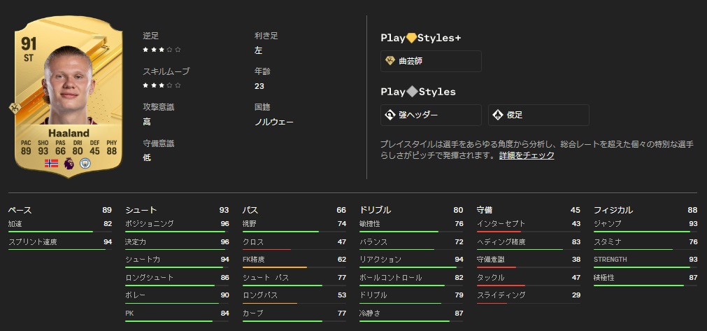 スピード89、シュート93、パス66、ドリブル80、守備45、フィジカル88