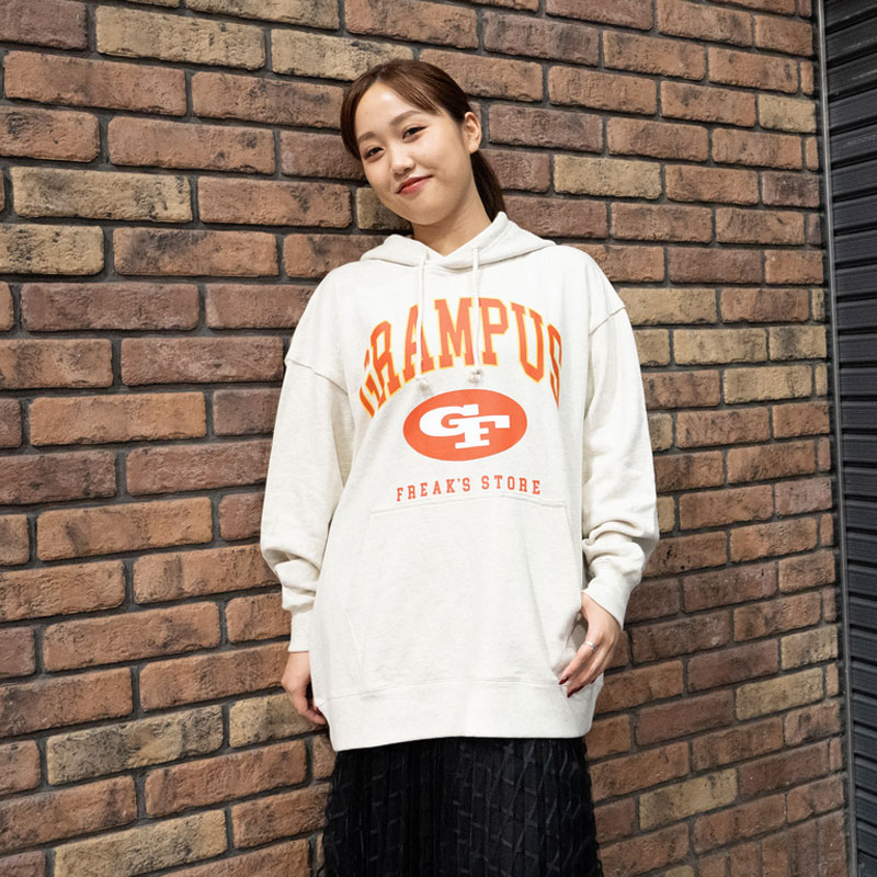 GRAMPUSの文字をアーチ状のカレッジロゴ風にデザイン。GFは「GRAMPUS」と「FREAK'S STORE」の頭文字を合わせたサークルロゴに。