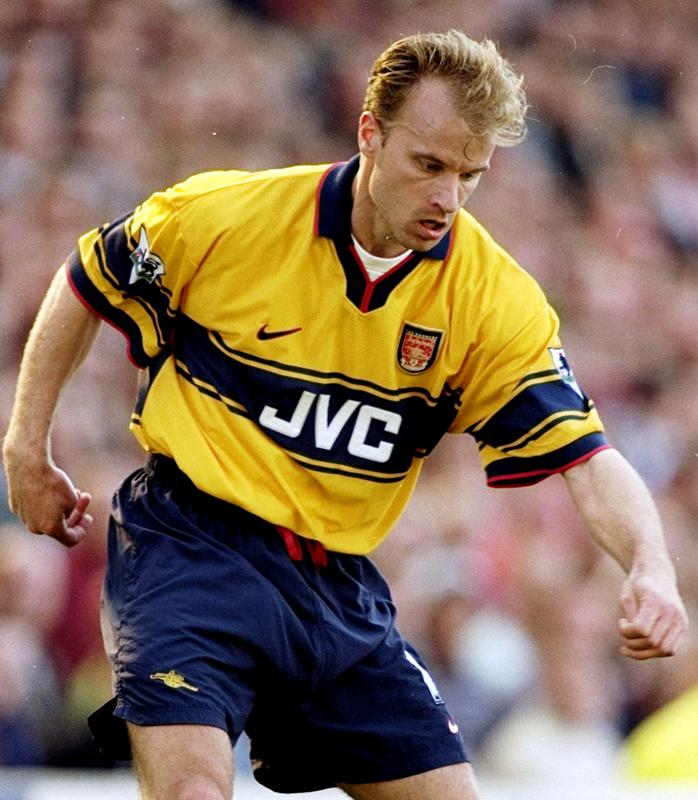 イエローを基調にネイビーとレッドのアンサンブルが美しいユニフォーム。当時の胸スポンサーは日本企業の「JVC(日本ビクター)」で、80年代・90年代のアーセナルを象徴する存在だった。