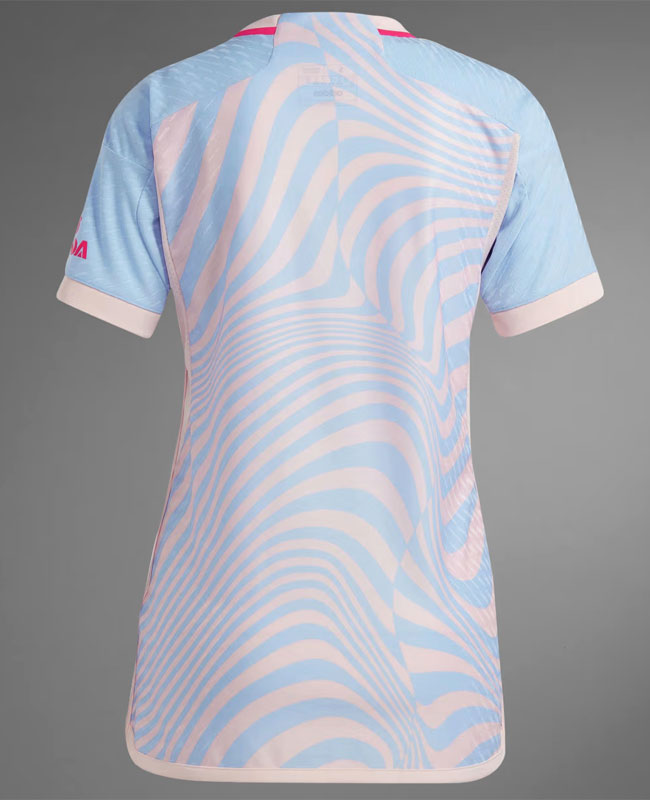 女子チームのアウェイにしてクラブ史上初の女子専用ユニフォームは、幾何学的なウェーブグラフィックが独特。ハローピンクとグローブルーのカラーブロッキングが鮮烈な印象を与えるデザインだ。