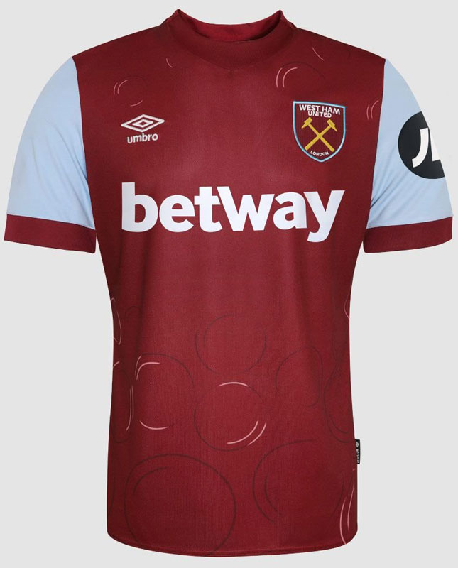今季のホームユニフォームはクラレット(ワインレッド)を基調にスカイブルーの伝統的な配色。そこにクラブ定番のサポーターソング(アンセム)「I'm Forever Blowing Bubbles」に由来するシャボン玉を描く。