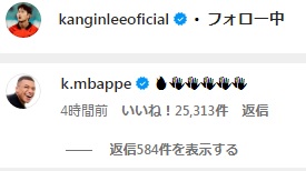 エムバペは拍手の絵文字で祝福、また、PSGを退団したばかりのマルコ・ヴェッラッティもハートの絵文字を投稿していた。