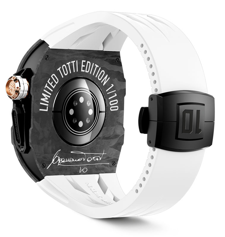 本製品は世界限定100本のみ製造。バックケースにはトッティ氏のサインと1~100のシリアルナンバーが刻印されている。さらにバックルには背番号である「10番」を刻印。現役時代の思い出がよみがえるデザインだ。