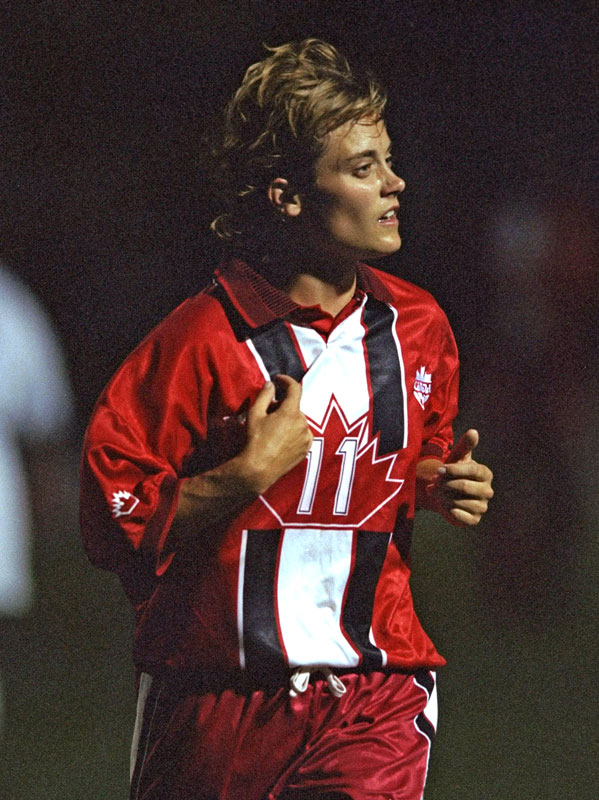 この画像は98年の女子ワールドカップ予選でのもの。当時のカエデの葉ユニフォームで掲載可能な写真はこの1枚しかない。なお、ユニフォームは男女どちらも同じデザインを使用している。