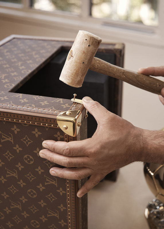パリ郊外のアニエールに構える歴史的なルイ・ヴィトンのアトリエにて 、経験豊かな職人たちによって手作業で製作された2つのトロフィー・トランク。その外装はお馴染みのモノグラム・キャンバスで覆われている。