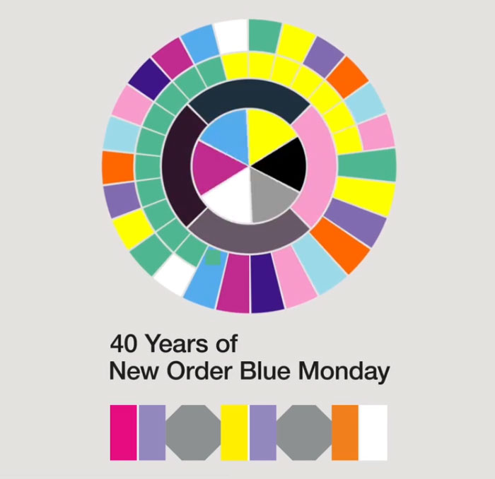 今回のコレクションはマンチェスター出身の世界的ロックバンドNew Order(ニュー・オーダー)の名曲「Blue Monday」の、カラーチャートを用いたアートワーク(ジャケット)をモチーフにしている。1983年に発表され今年で40周年を迎えたこの曲のアートワークを手掛けたのはサヴィルだ。