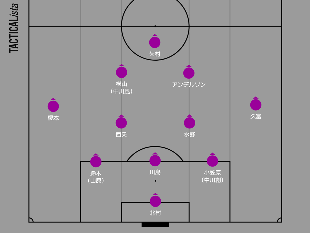 攻撃をリードする2シャドーは、右がフィジカルを生かしてターゲットになるアンデルソン、左が攻撃スキル全般に秀でる横山暁之がファーストチョイス。