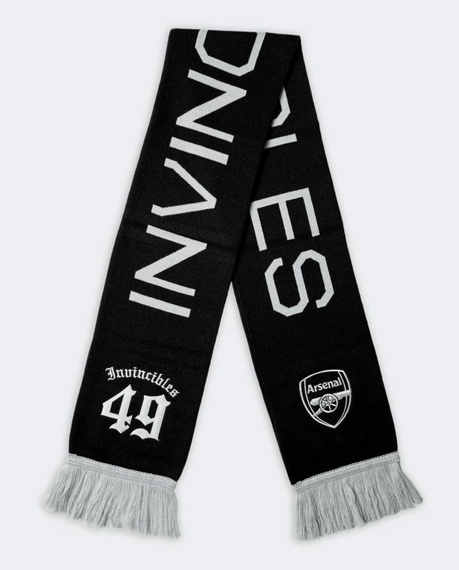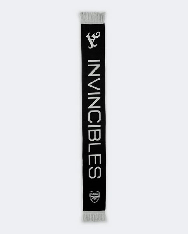 ゴシックフォントでエンブレム、「A」ロゴ、インヴィンシブルズロゴをデザインした両面織りのジャガードマフラー。素材はアクリル100%。