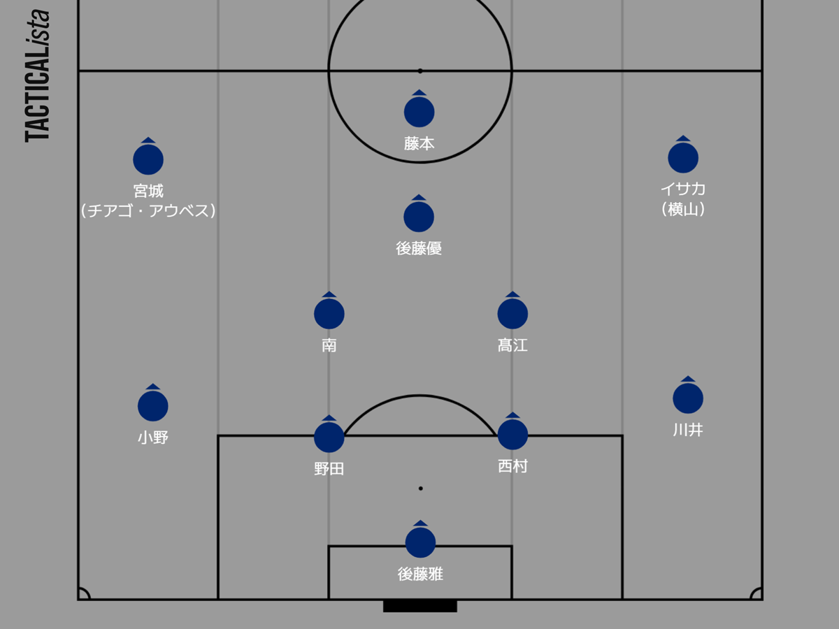 守護神は今季も最後尾からチームを支えた後藤雅明で、4バックは右から川井歩、西村 慧祐、野田裕喜、小野雅史という不動のラインナップ。
