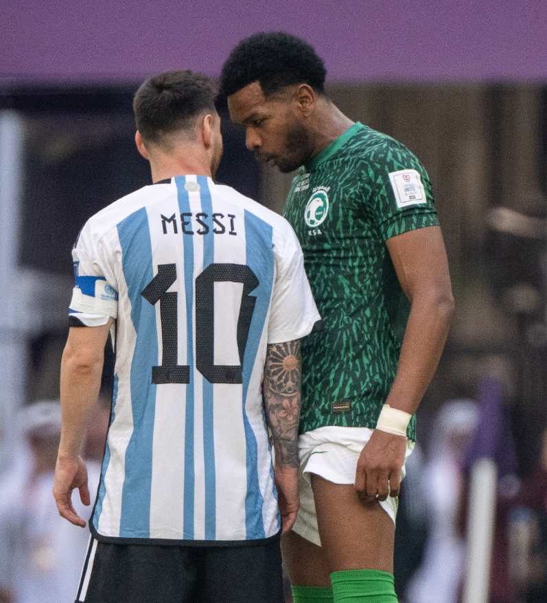 スタンドからはロナウドに対してメッシの大合唱も聞こえているが、サウジアラビア代表であるアル・ブリーヒは昨年末のワールドカップでメッシに対しても詰め寄った選手だ。