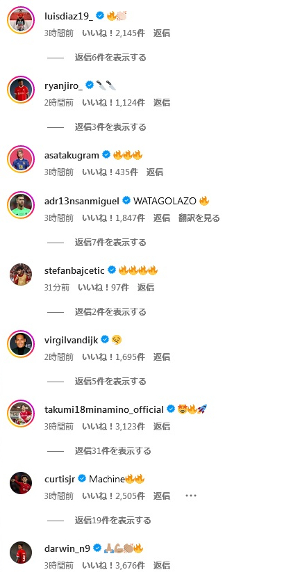 この投稿にリヴァプールや日本代表のチームメイトたちが反応している。