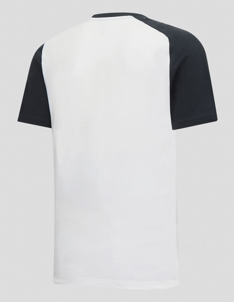 オレンジの差し色が鮮やかで印象的なTシャツ。ラグランスリーブ構造で100%コットン素材。
