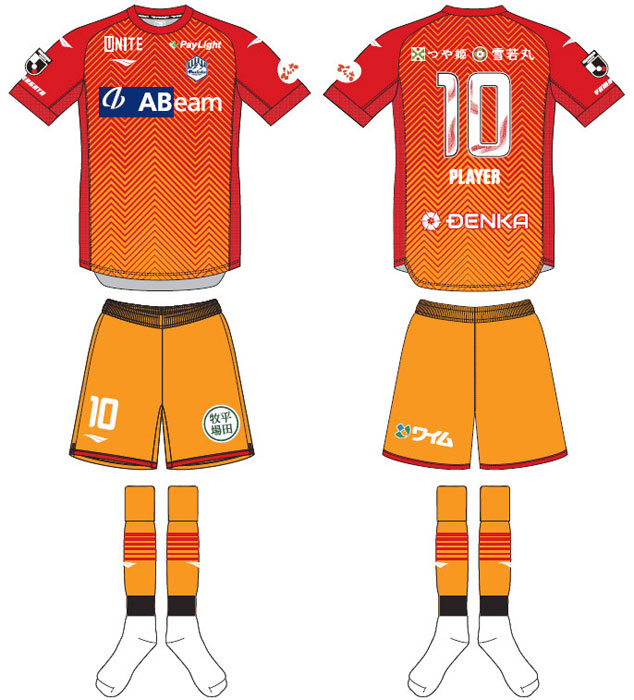 画像で確認できる各部スポンサーは、胸に「ABeam(アビームコンサルティング)」、背中上に「つや姫」と「雪若丸」、背中下に「DENKA(東北電化工業)」、鎖骨右に「UNITE(クリエイト礼文)」、鎖骨左に「Pay Light(スマートチェックアウト)」、左袖に「でん六」、パンツ前面に「平田牧場」、パンツ背面に「ワイム」。