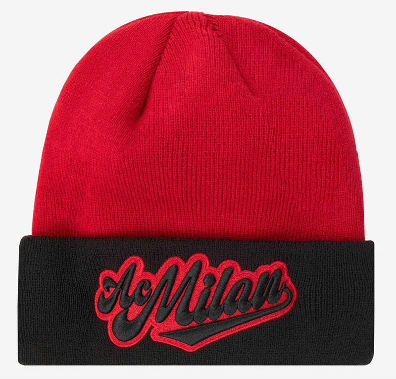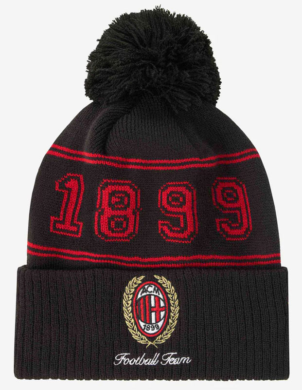 ポンポン付きのニットキャップで、デザインはミランの愛称ロッソネロ(赤と黒)そのもの。前面の刺繍エンブレムが存在感を放つ。