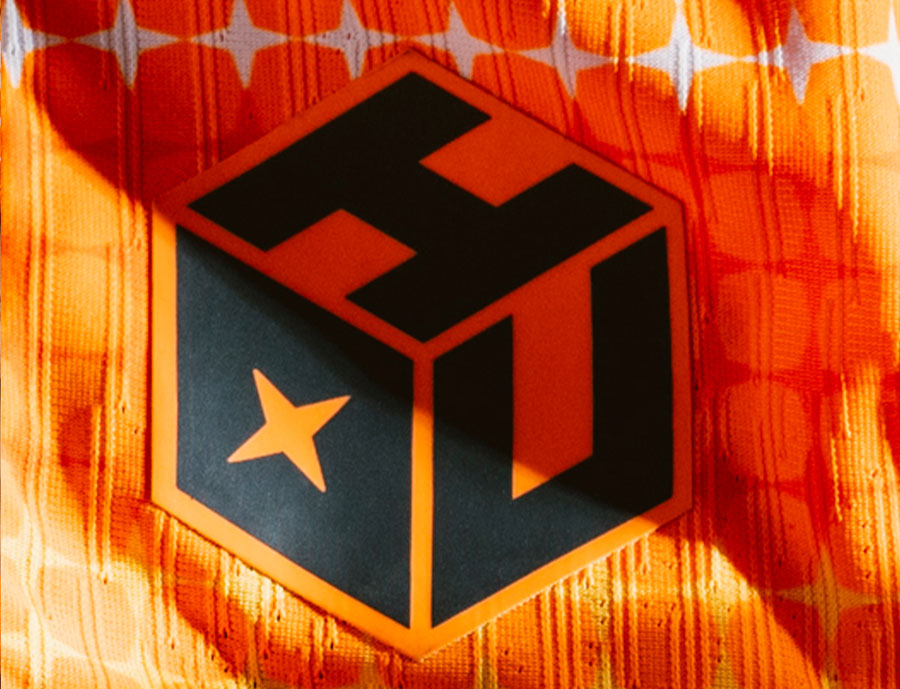 シャツの右裾にはエンブレムの形をした“HOU”ロゴをデザインする。これはホームタウンのヒューストンにある「ウィリアム・P・ホビー空港」の空港コード。中心にクエーサーを配しアルファベットの“X”に見立てた文字「O」で、ローマ数字の“10”を表現しクラブの10周年を祝う。