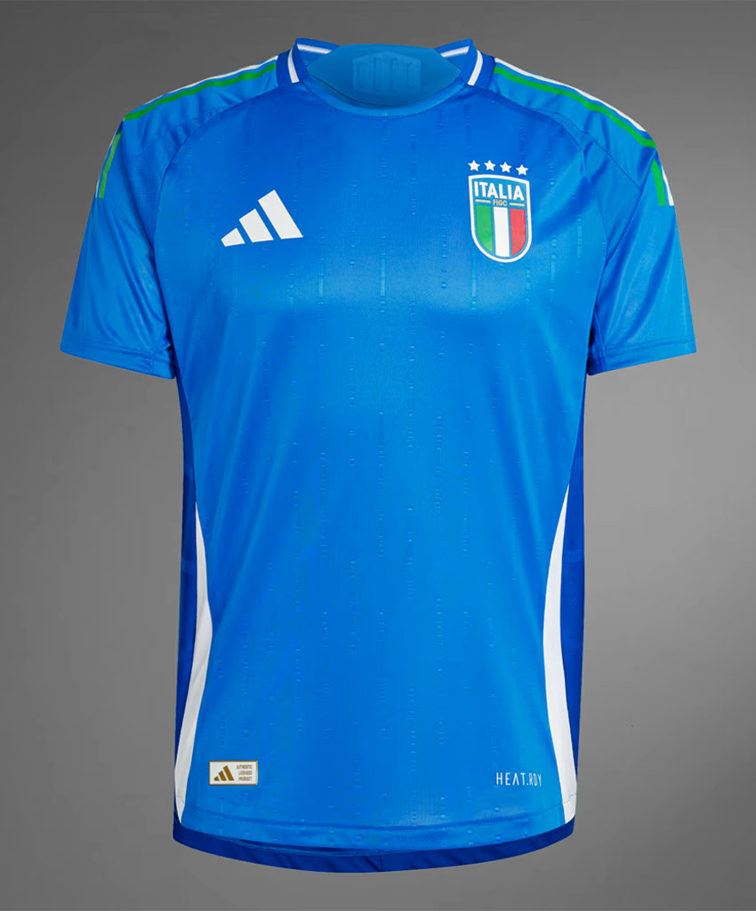 2024新ホームユニフォームは鉄板のブルーを基調に、シャツ全体をイタリア国旗の3色“トリコローレ”で彩るデザインが登場。前回大会王者は基本的に伝統を継承しつつも、新たなひねりを加えたスタイルとなった。