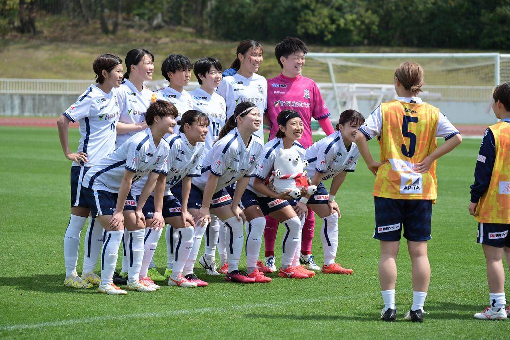 しっぺい太郎とともに写真を撮る静岡SSUボニータ