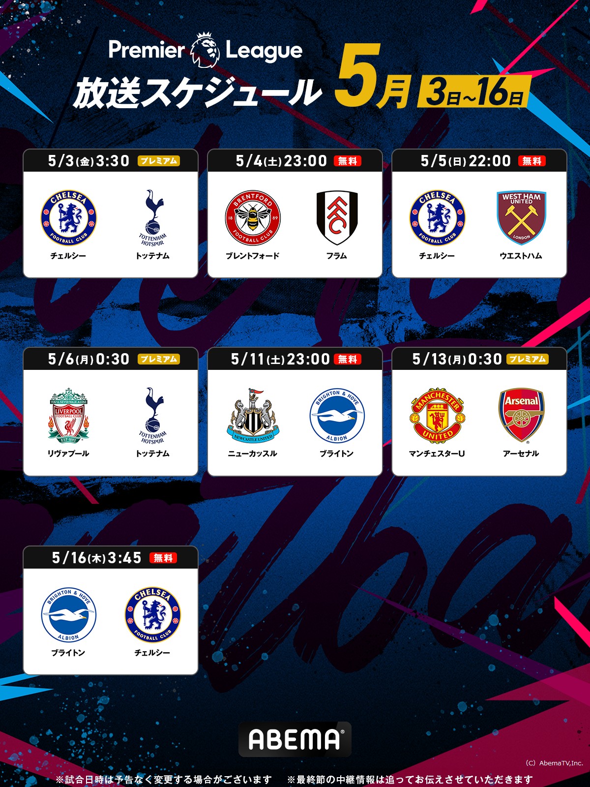■「ABEMA」 『プレミアリーグ 2023-24シーズン』 第36節、第37節、延期節 放送スケジュール