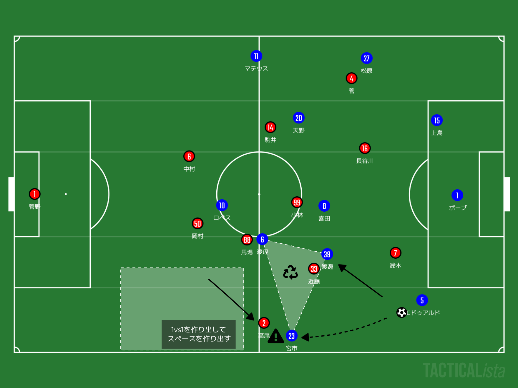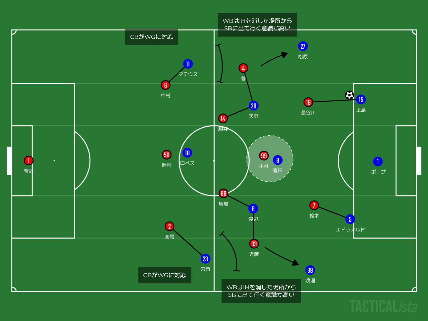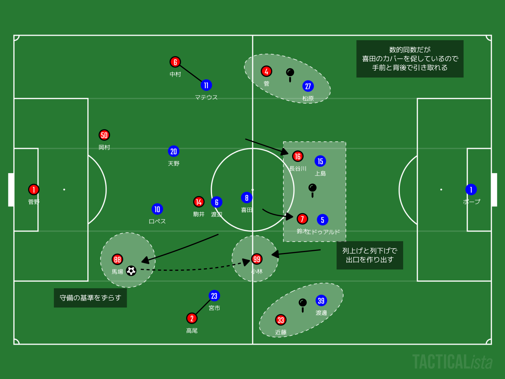 このように小林選手と長谷川選手、鈴木選手が列の入れ替えを行ったことによって、マリノスCBをピン止めしたこと、さらにWBが高い位置をとることによってSBを止めたことにより、喜田選手周辺でボールを引き取れるようになっていました。さらに喜田選手はIHのカバーを常に取り続けるタスクがあるので、視界外から降りてくる小林選手の対応がワンテンポ遅れます。