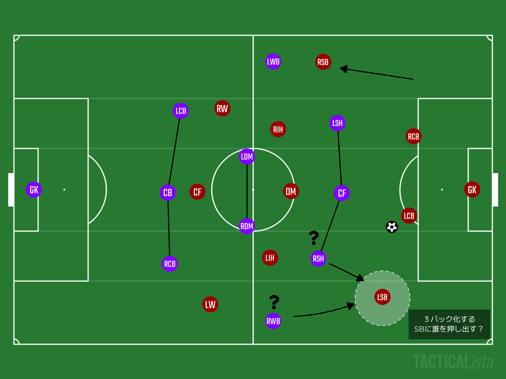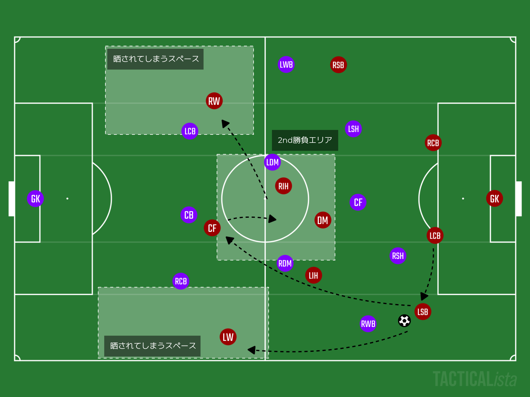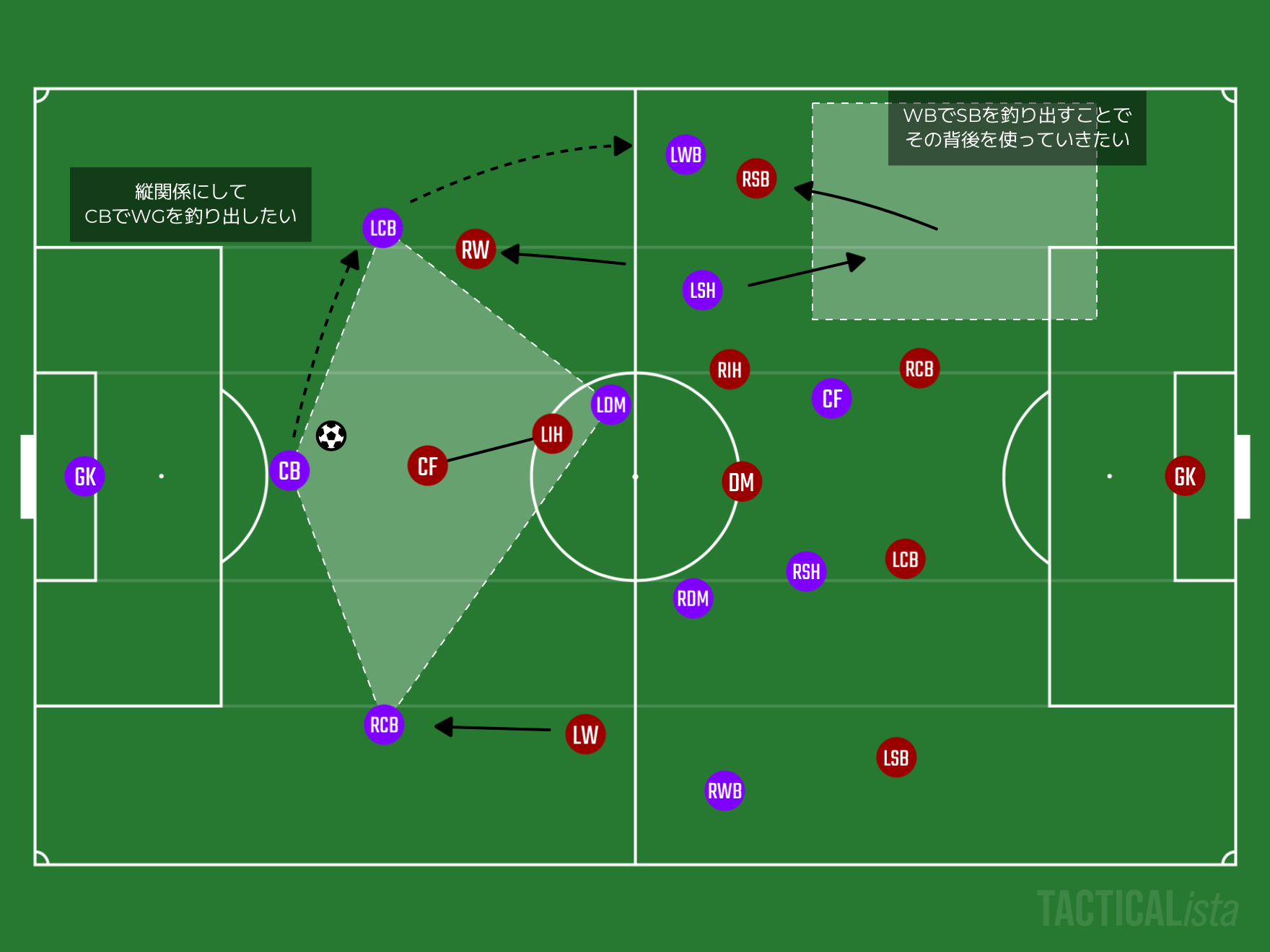 これをするためにCHのどちらかがDMFのような立ち振る舞いをする必要もあるかもしれません。これによってSTと列を上げるCHがIHのような立ち振る舞いをしながらWBの並行のサポートと、WBで引っ張り出したSBの背後を使える状況を作り出すことができるでしょう。