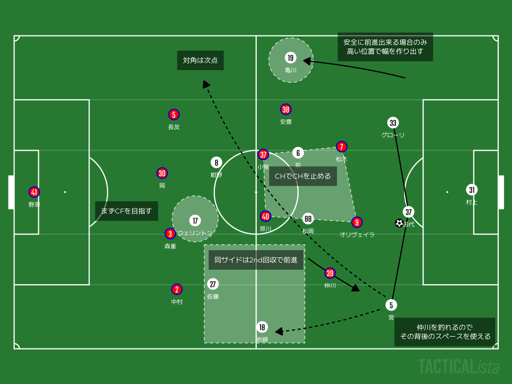 実際に昨シーズンのアウェイ神戸戦。バックラインに残るSBに対してWBを押し出した先の背後のスペースをウイング(以下WG)に使われてしまい、佐々木選手、塩谷選手、荒木選手が広大なスペースで晒されてしまって敗戦を喫しています。この敗戦があるからこそ、SBに対して誰を押し出していくのかは重要なポイントになると考えています。