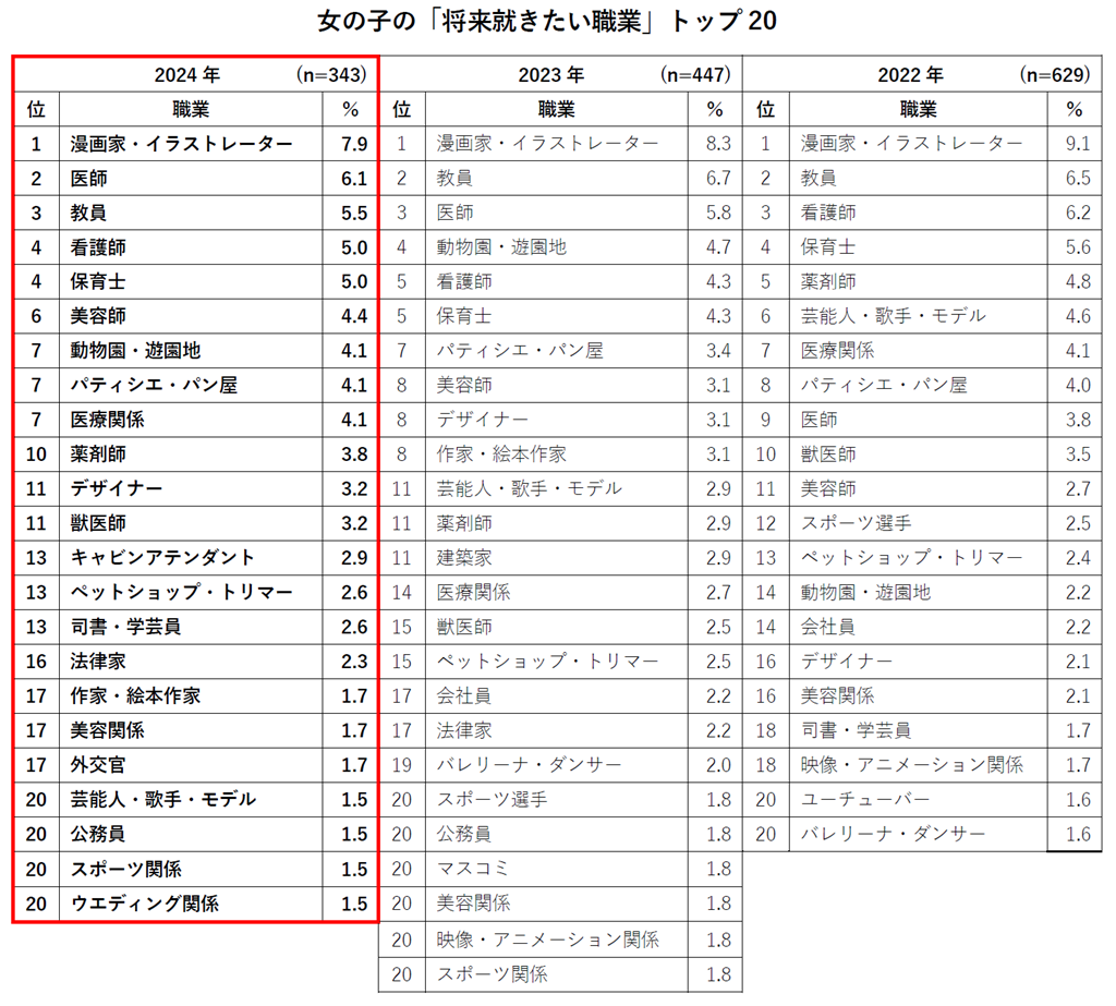女子では「漫画家・イラストレーター」が3年連続トップに。