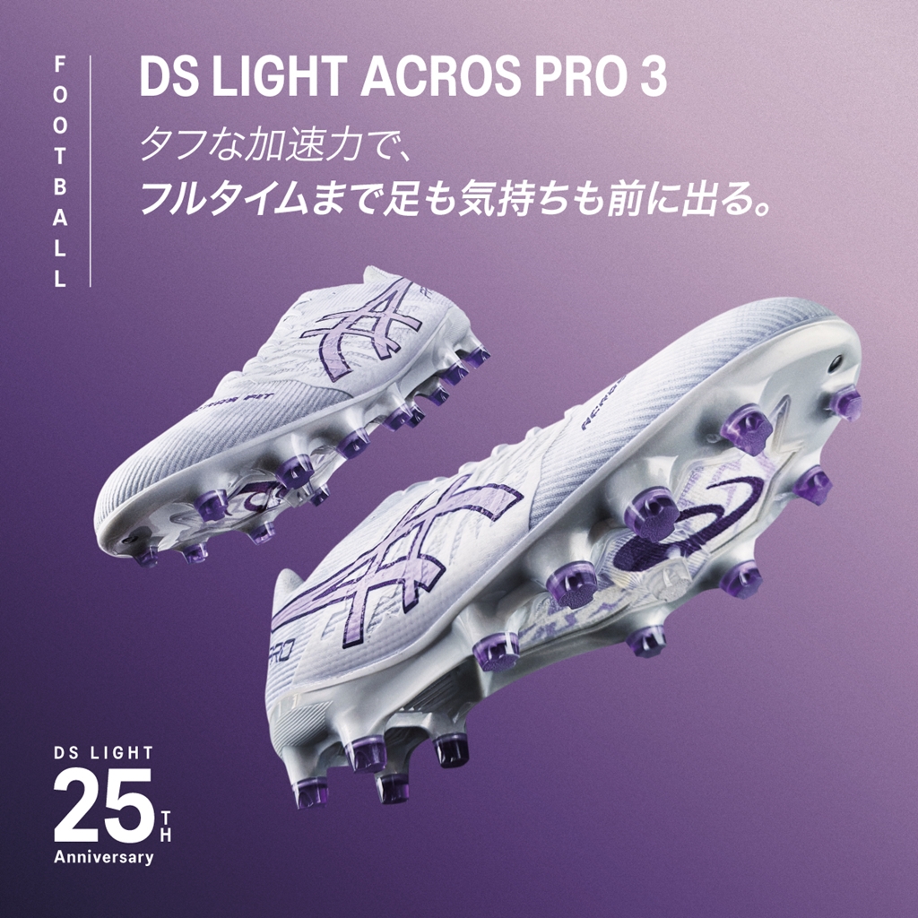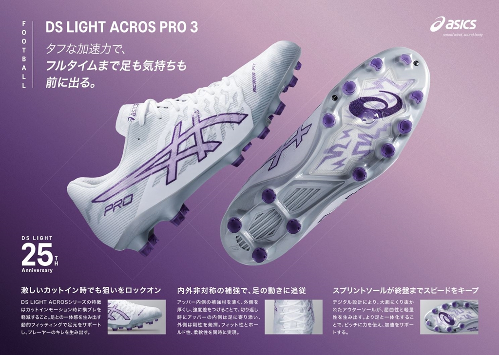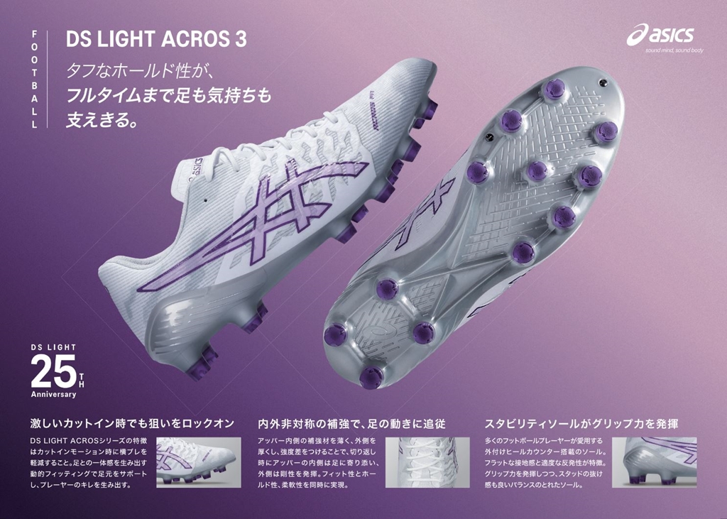 アシックスジャパンは11日、切り返し時の安定性を追求し、試合終盤まで優れたホールド性を発揮するサッカー用スパイクシューズ『DSライト アクロス PRO 3』と『DSライト アクロス 3』を発表した。