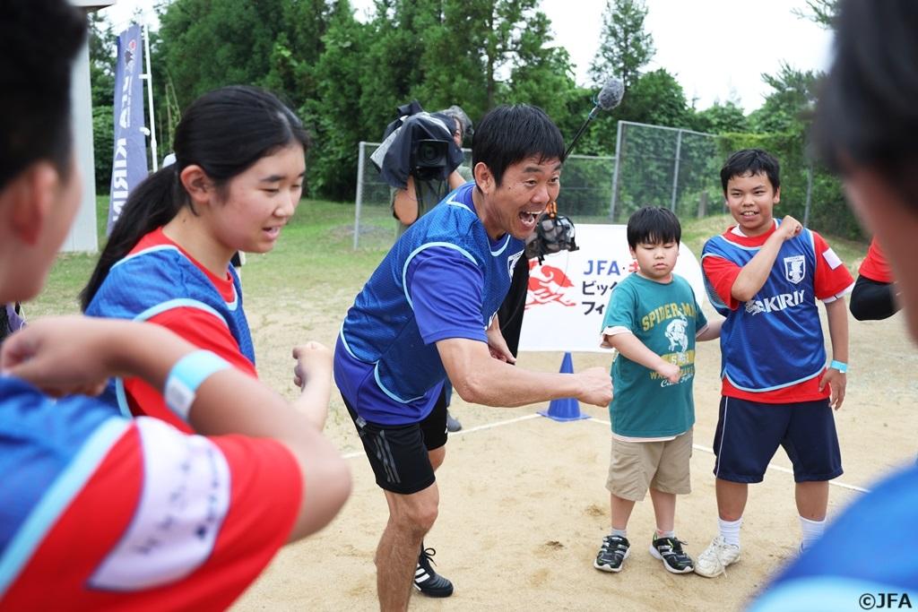 そんな中、森保監督はチームメンバーと「ナイス」の掛け声とともに開催場所の“珠洲市”にかけた“Sのポーズ”(ゴールパフォーマンス)を披露。ゲスト参加した元日本代表の巻誠一郎氏のチームもハイタッチで参加者とゴールパフォーマンスを楽しんだ。