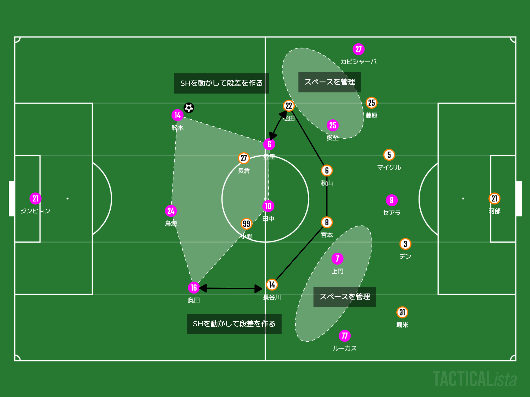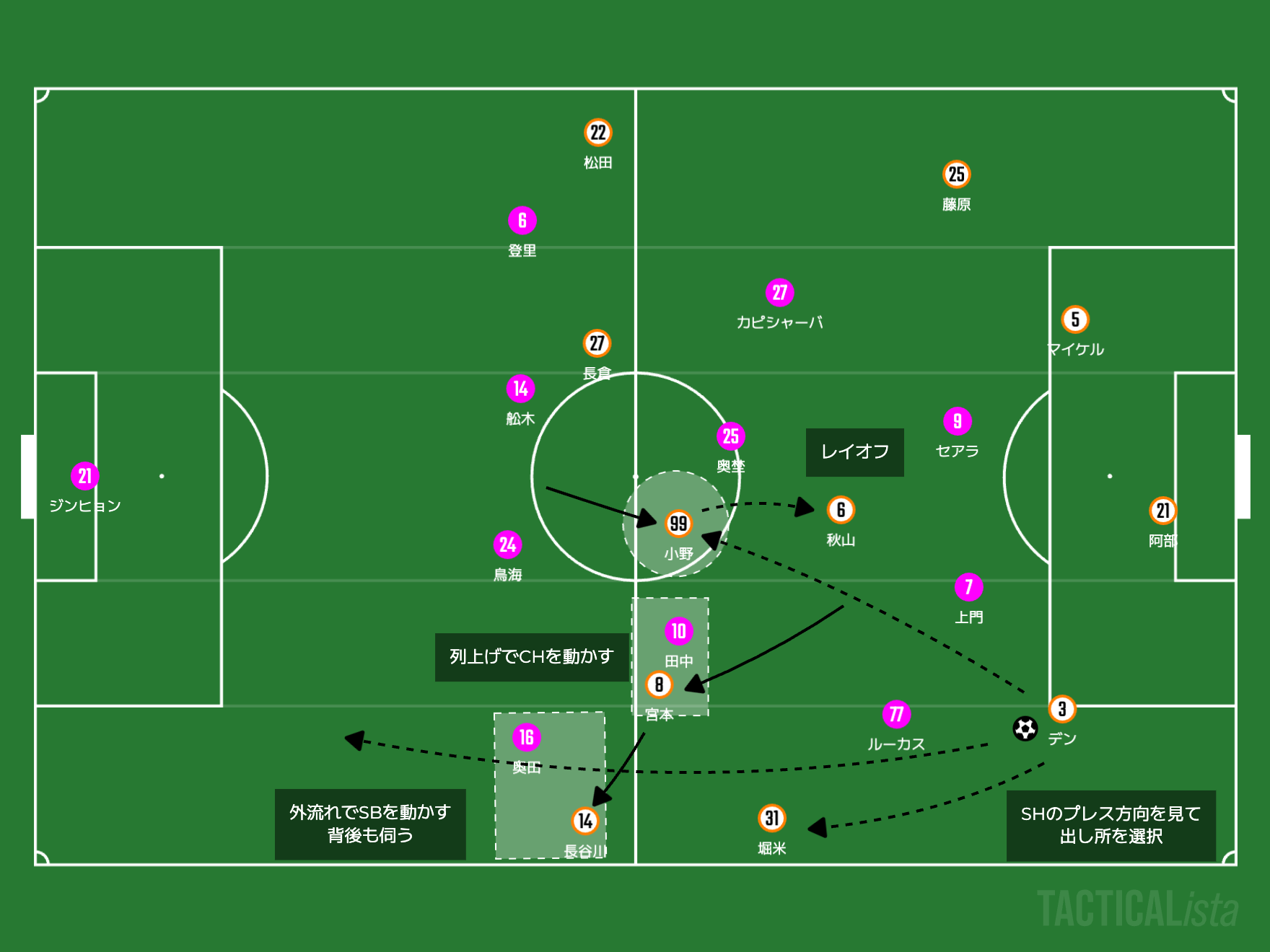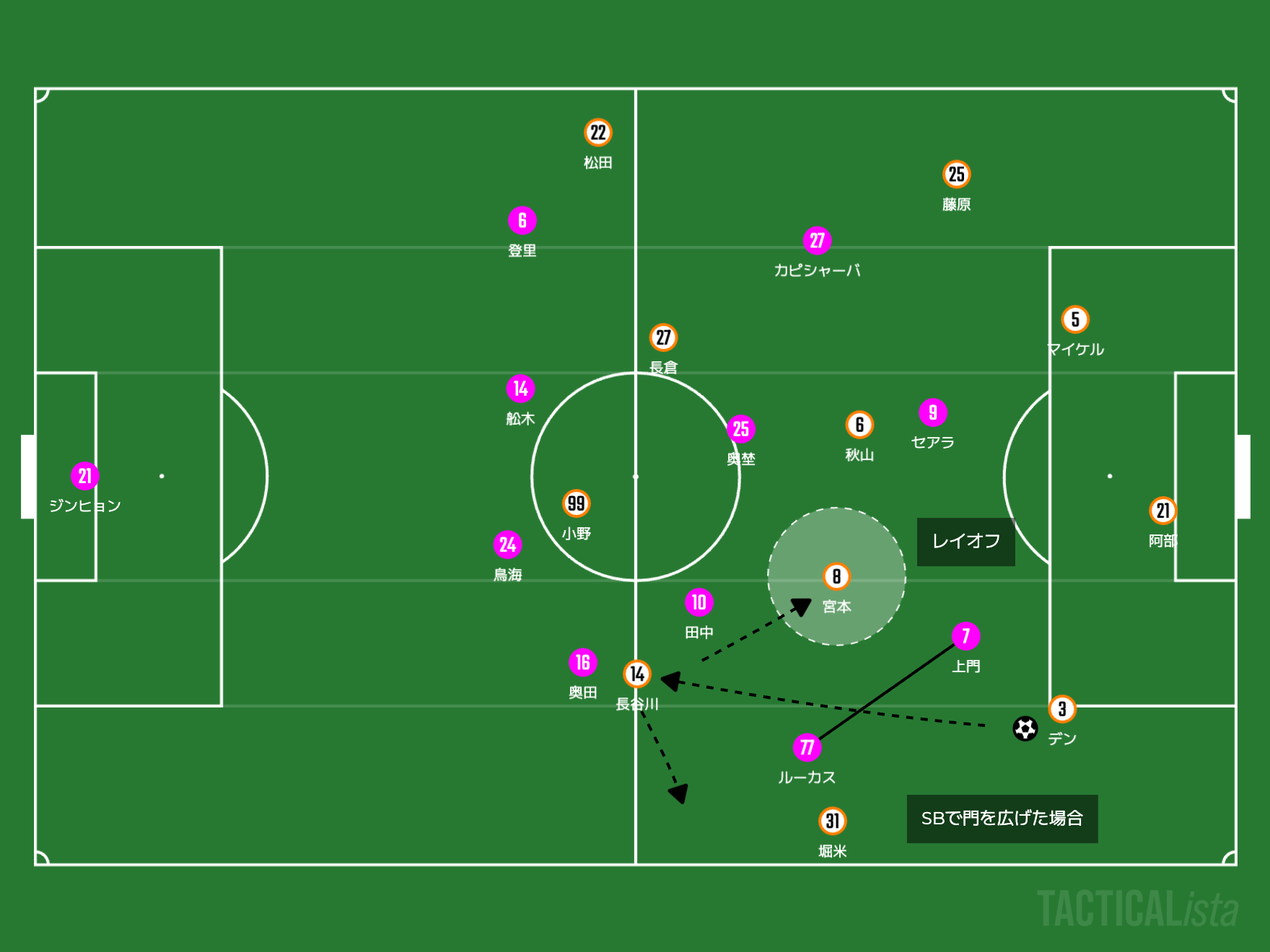 このようにCFとSHの門を広げた先に立つのがSHの長谷川選手で彼が壁となって、CHでレイオフを作り出します。これができるのはCBで1stプレスラインを、そして内側に入ったSHで田中選手や奥埜選手に影響を与えたことで、MF−FWのライン間を広げることができたからです。